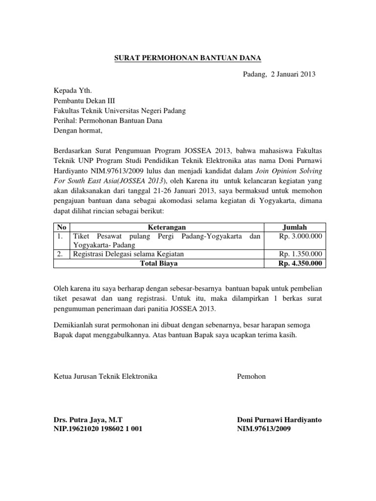 Misalnya untuk memohon dana, pekerjaan, izin, atau kegiatan lain yang bersifat resmi atau formal. Berikut contoh surat permohonan dana kegiatan hut ri untuk meminta bantuan dana pada masyarakat jika kita sudah mempunyai surat permohonan dana tersebut tentunya masyarakat akan percaya dan akan dengan sadar hati memberikan bantuan dana. Surat permohonan ✅ merupakan surat yang berisi permohonan ? Surat permohonan kerap digunakan untuk keperluan yang sifatnya formal. Pasalnya untuk permohonan izin tidak hanya. Dan salah satu jenis surat permohonan yang mungkin paling sering kita jumpai adalah surat permohonan dana atau bantuan dana. Di atas adalah proposal yang di jilid dan ini adalah surat permohonan yang akan di ajukan ke perusahaan Surat inilah yang dikenal dengan sebutan surat permohonan. Pembangunan mesijid tentunya membutuhkan dana yang tidak sedikit. Contoh surat permohonan dana pembangunan mesjid. Pembangunan mesijid tentunya membutuhkan dana yang tidak sedikit. Bersama surat ini kami mau menyampaikan sebuah permohonan bantuan dana untuk bisa mengadakan pelaksanaan natal. Atas perhatian dan bantuan dari bapak/ ibu saya ucapkan banyak terima kasih.